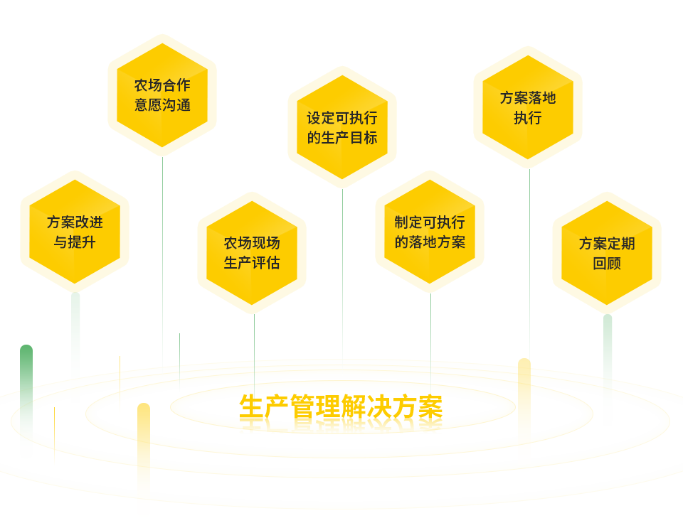 農場合作意愿溝通、農場現場生產評估、設定可執行的生產目標、制定可執行的落地方案、方案落地執行、方案定期回顧、方案改進與提升,