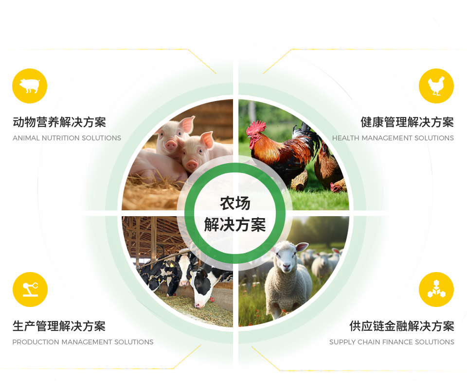 截止目前,集團主要產品覆蓋豬、家禽、反芻動物等,主要解決方案覆蓋動物營養、生產管理、健康管理、供應鏈金融方案等內容,致力于成為農場整體解決方案引領者,提升農場生產安全和效能。